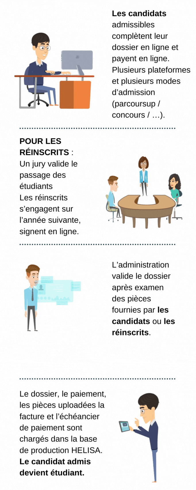 Le dossier, le paiement, les pièces uploadées la facture et l’échéancier de paiement sont chargés dans la base de production HELISA. Le candidat admis devient étudiant. Le contrat d’étude est signé électroniquement.